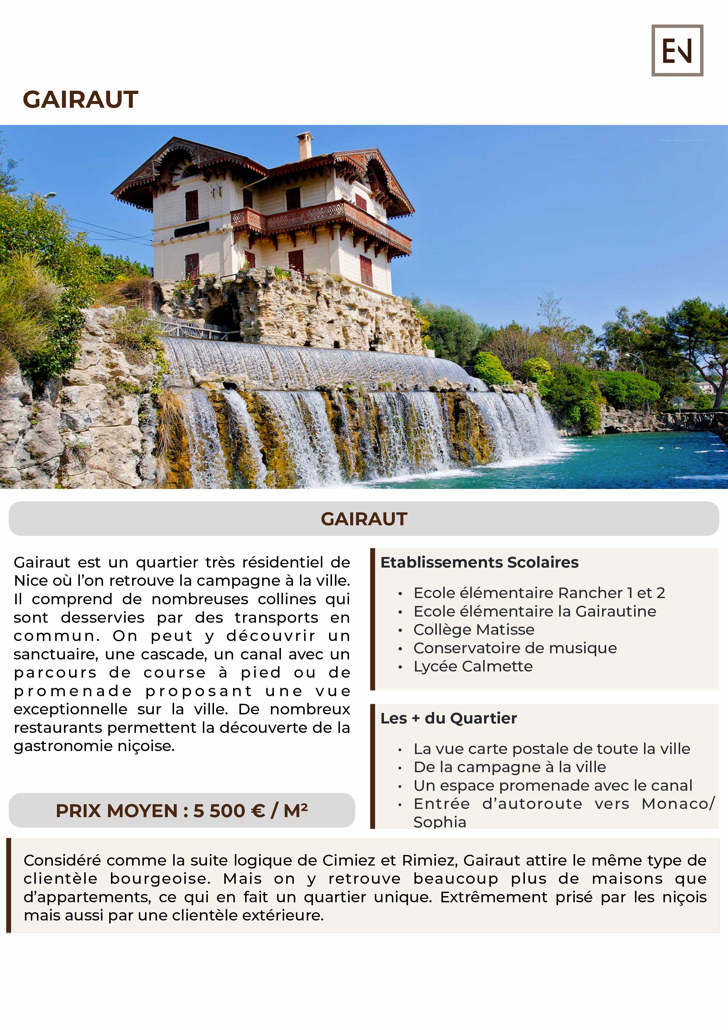 Gairaut est un quartier très résidentiel de Nice où l’on retrouve la campagne à la ville. Il comprend de nombreuses collines qui sont desservies par des transports en commun.