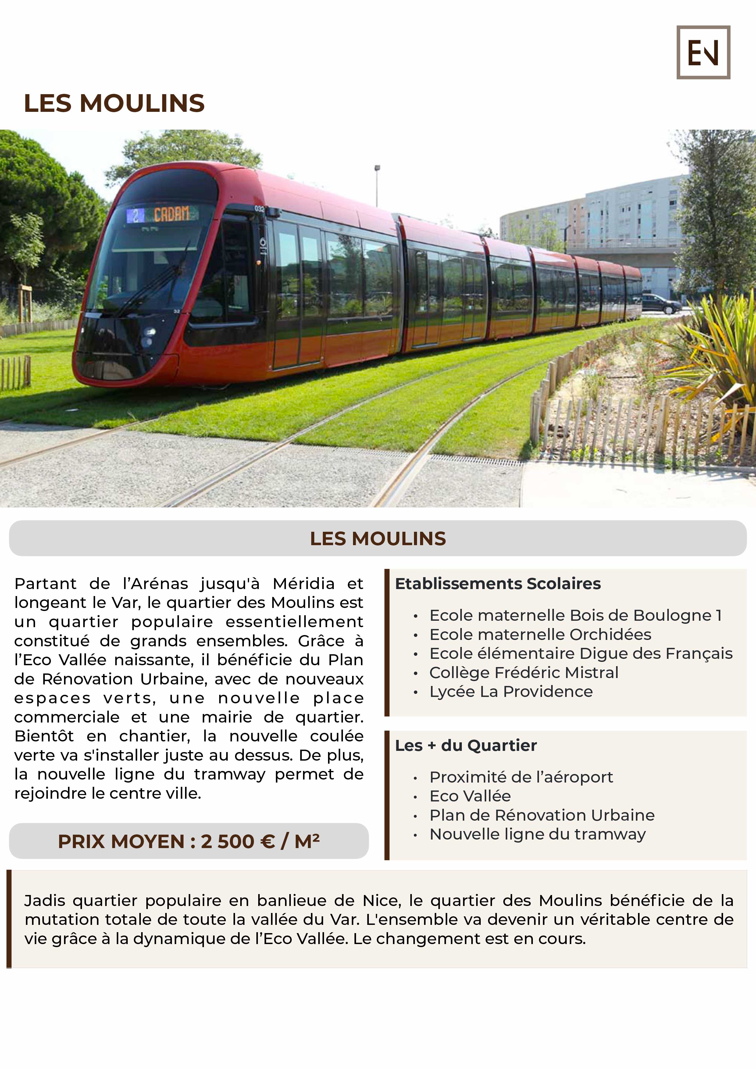 Jadis quartier populaire en banlieue de Nice, le quartier des Moulins bénéficie de la mutation totale de toute la vallée du Var. L'ensemble va devenir un véritable centre de vie grâce à la dynamique de l’Eco Vallée. Le changement est en cours.
