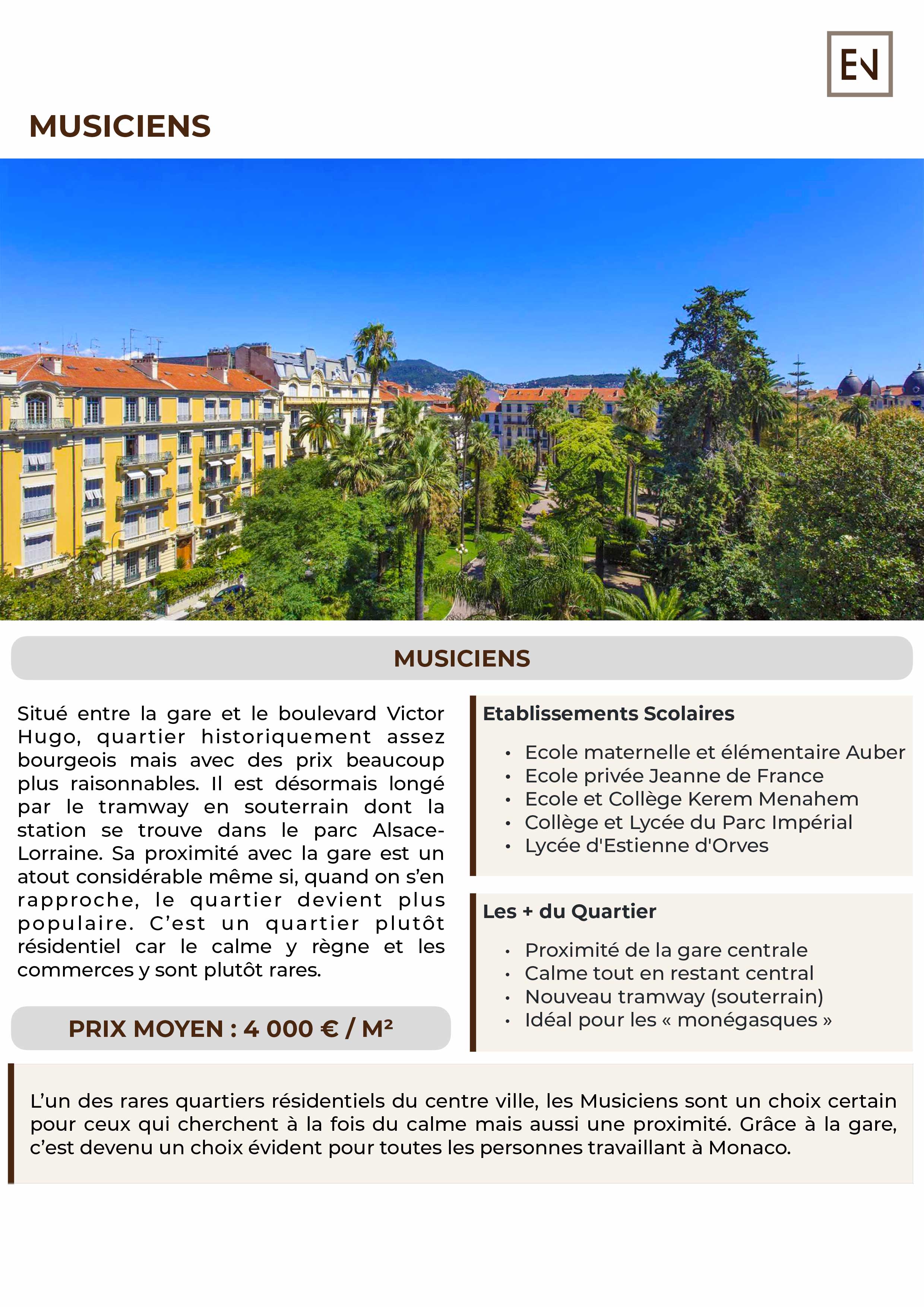 L’un des rares quartiers résidentiels du centre ville, les Musiciens sont un choix certain pour ceux qui cherchent à la fois du calme mais aussi une proximité. Grâce à la gare, c’est devenu un choix évident pour toutes les personnes travaillant à Monaco.