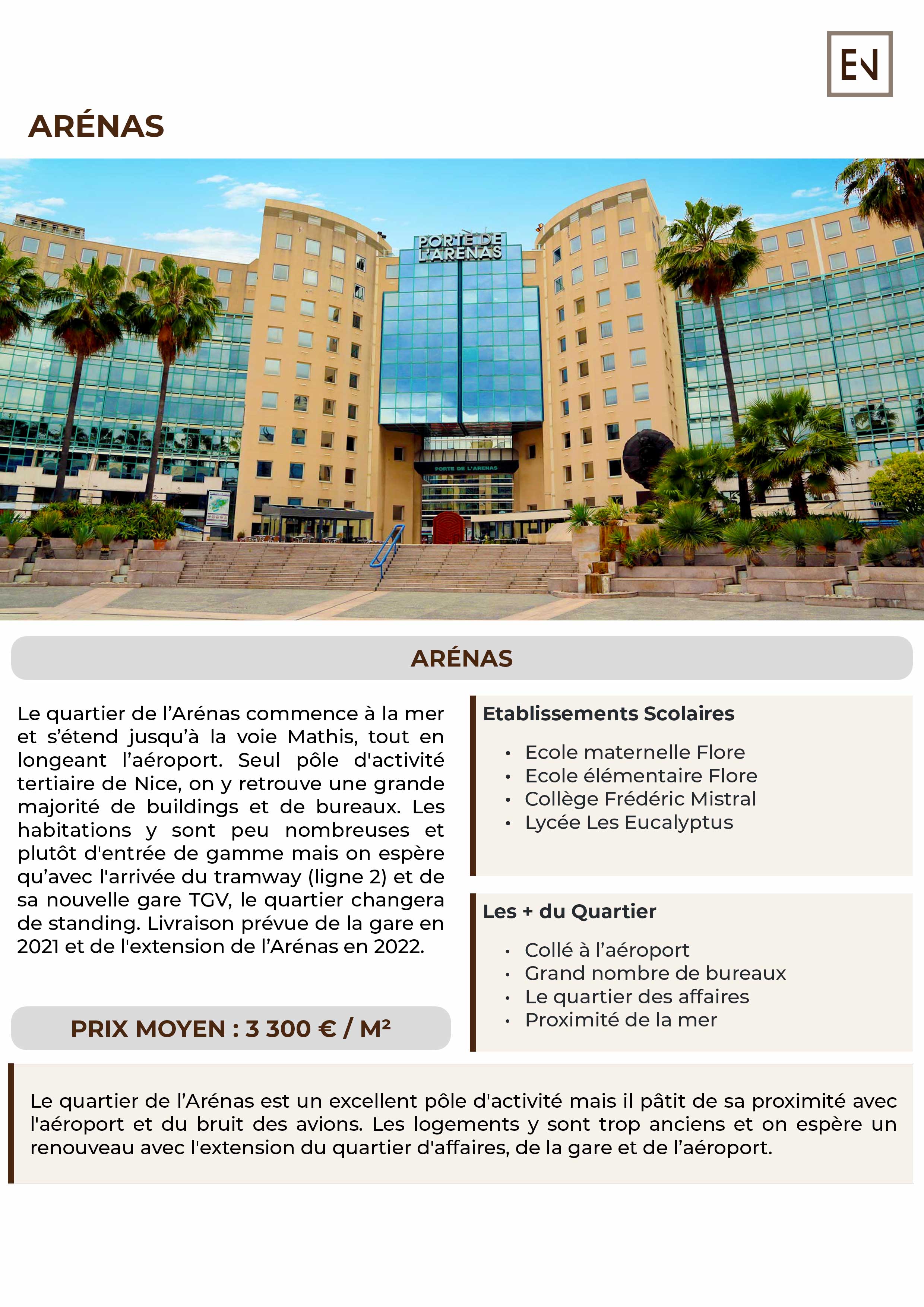 Le quartier de l’Arénas commence à la mer et s’étend jusqu’à la voie Mathis, tout en longeant l’aéroport.