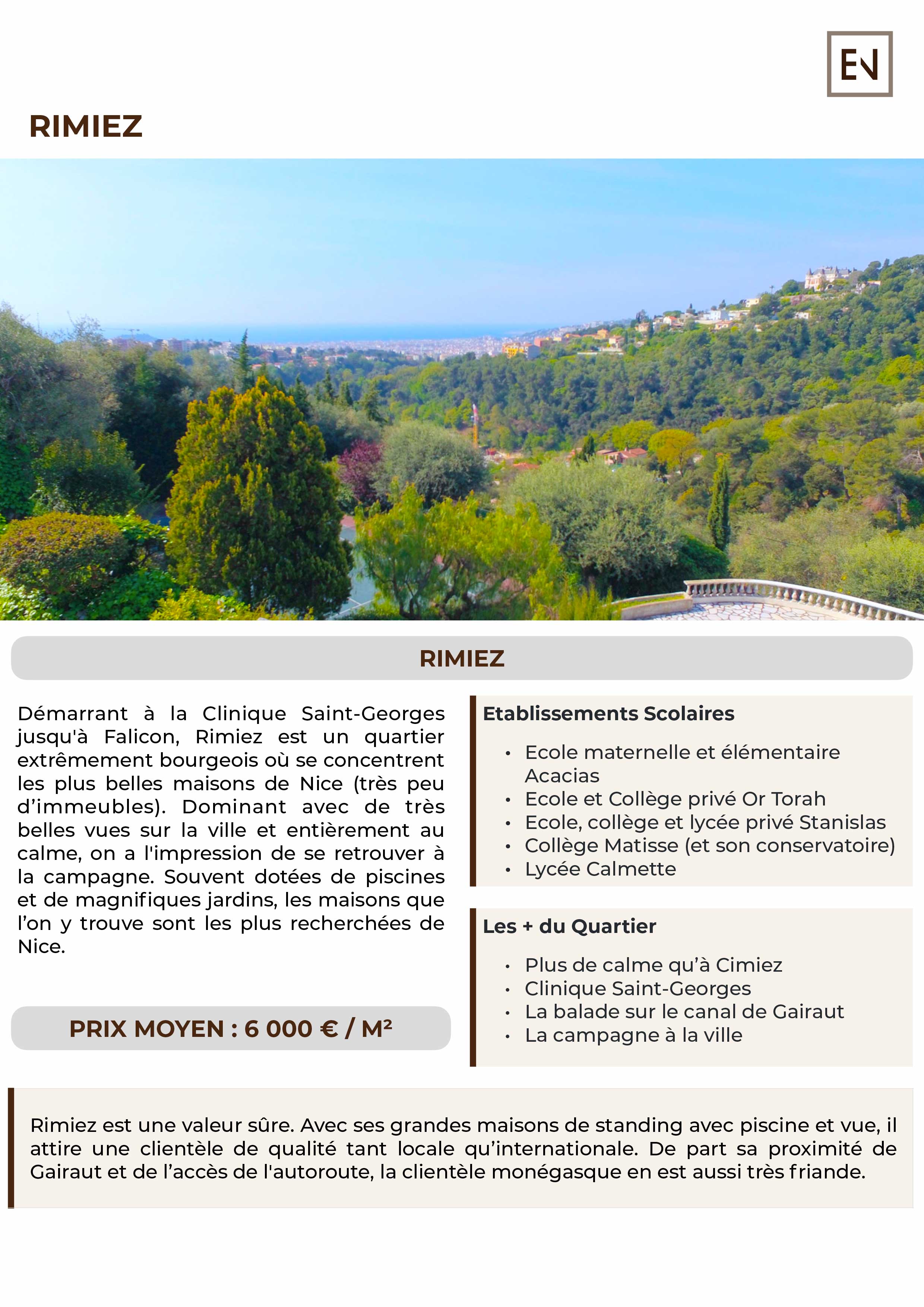 Rimiez est une valeur sûre. Avec ses grandes maisons de standing avec piscine et vue, il attire une clientèle de qualité tant locale qu’internationale. De part sa proximité de Gairaut et de l’accès de l'autoroute, la clientèle monégasque en est aussi très friande.