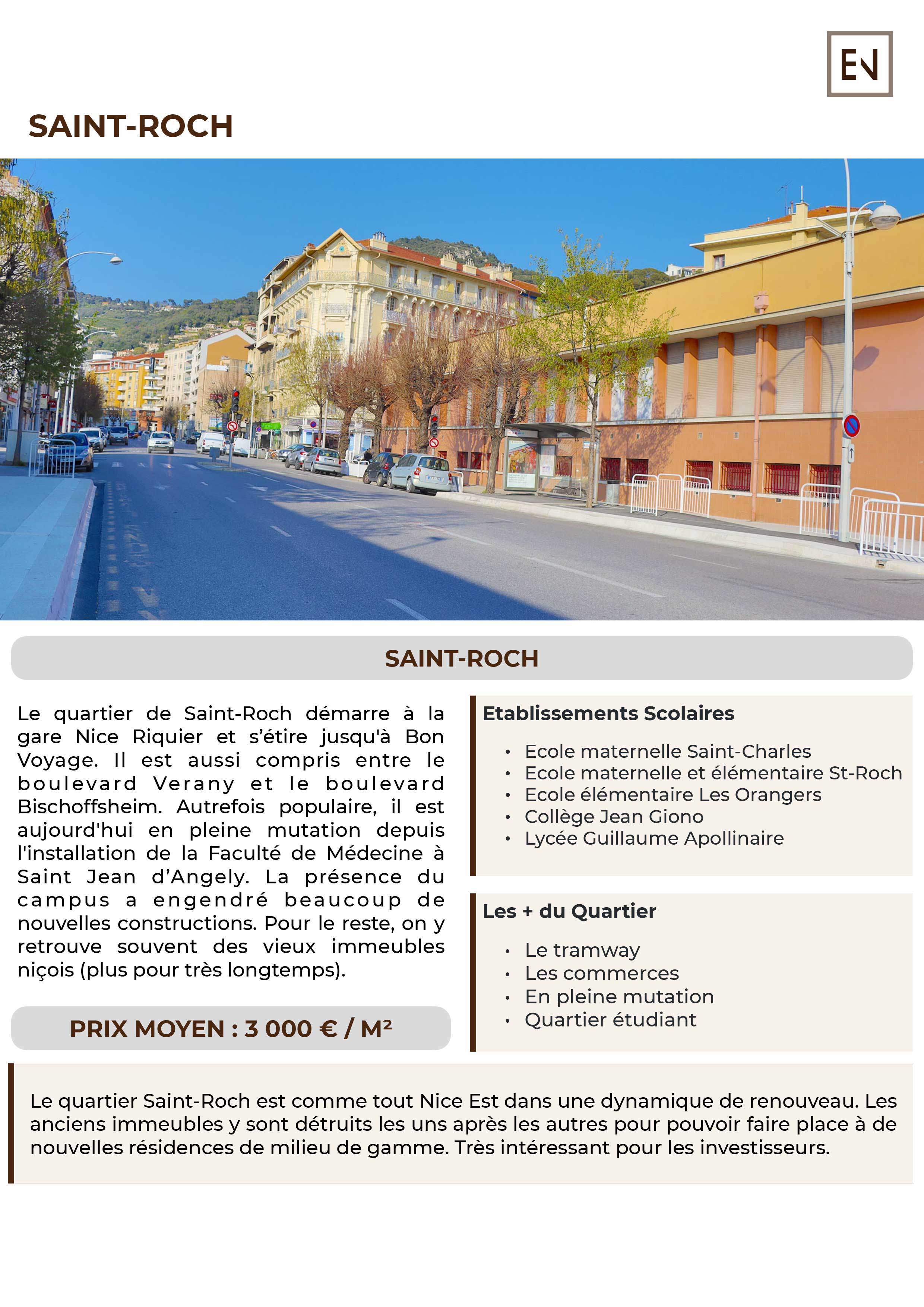Le quartier Saint-Roch est comme tout Nice Est dans une dynamique de renouveau. Les anciens immeubles y sont détruits les uns après les autres pour pouvoir faire place à de nouvelles résidences de milieu de gamme. Très intéressant pour les investisseurs.
